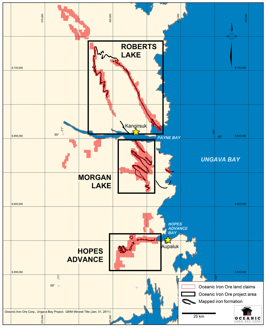 Oceanic is focused on the development of the Ungava Bay iron properties. These properties comprise more than 3,000 claims over three project areas, namely Hopes Advance, Morgan Lake and Roberts Lake, which are located over approximately 1,500 km2 along the northern extension of the Labrador Trough in the Nunavik Region of northern Quebec. The projects cover over 300 kilometres of iron formation and all the deposits are located within 20 – 50 km of tidewater.