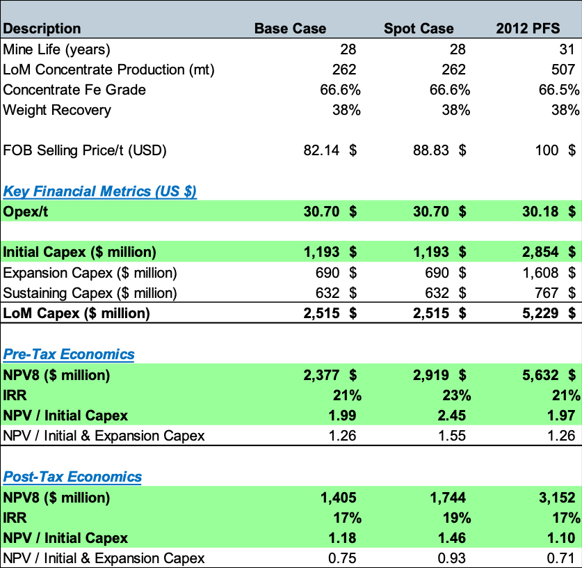 - Base case FOB selling price of USD $82/t, versus US $100/t in the 2012 PFS