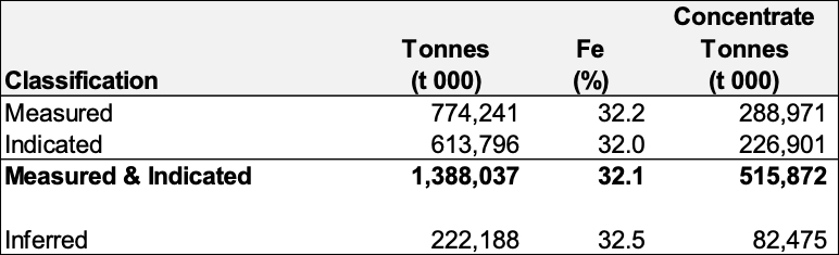 Table 4 below presents the subset of the Mineral Resources that are contained within the open pit designs that were used to develop the life of mine plan for the Study. The resource subset is reported above a cut-off grade of 25% Fe and includes mining dilution and mining losses which were estimated to be 1.5% and 5% respectively.